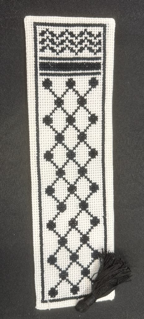Created using traditional Palestinian tatreez, a counted thread embroidery technique. Tatreez is an art form that carries deep cultural meaning and has long served as a form of communication among women.