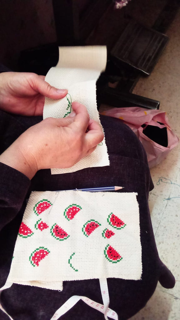These pieces are hand-stitched by six Palestinian women displaced since 1948 Nakba, originally from Yaffa and Lod, not allowed to return or live a normal life due to refugee status, now living in the Al-Wehdat, Al-Yarmouk, and Al-Baqa’a refugee camps in Jordan, resisting and preserving their heritage as part of their daily lives.